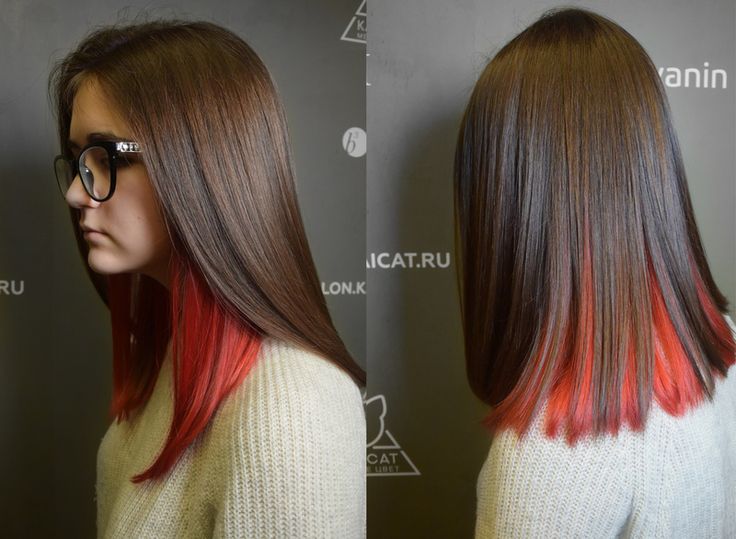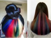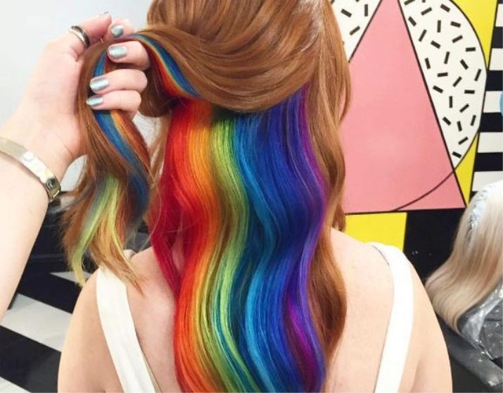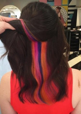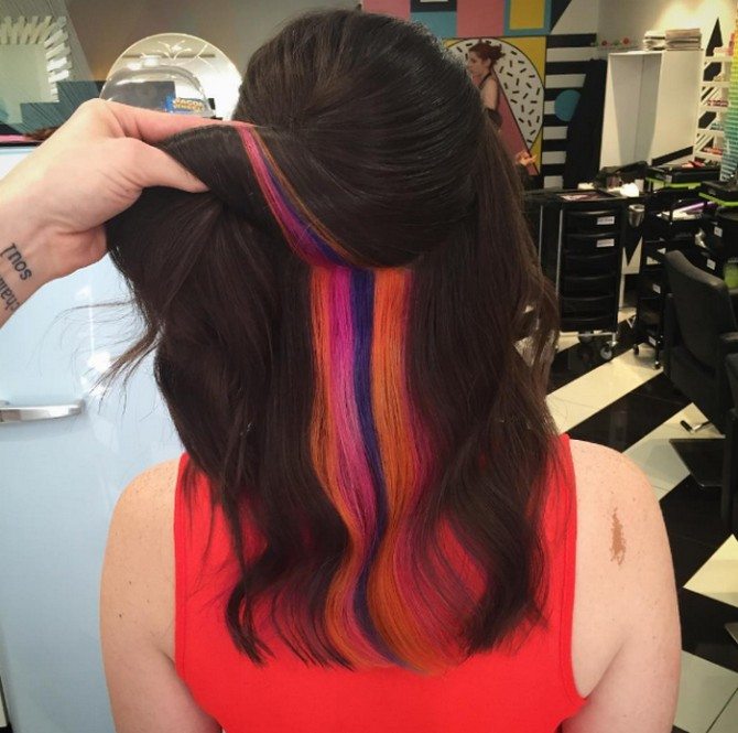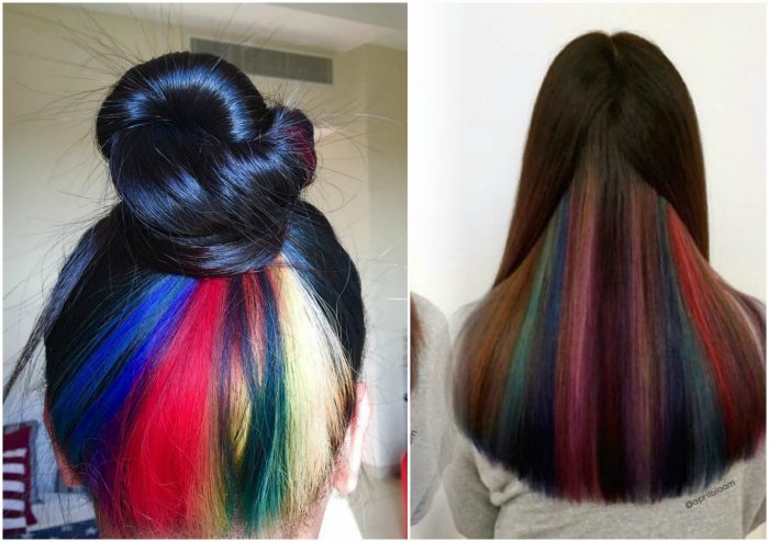 Ang nakatagong kulay ay dumating sa amin mula sa foggy Albion at pinamamahalaang upang manalo ng maraming mga tagahanga. Ang kakanyahan ng pamamaraan na ito ay ang pangulay sa mas mababang o gitnang layer ng buhok, na kung saan ay sarado sa ilalim ng pangunahing mga hibla. Ang pamamaraan na ito ay lalong popular sa mga nakababatang henerasyon, pati na rin sa mga batang babae na nais dramatikong pagbabago sa hitsura, ngunit para sa isang kadahilanan o iba pang ito ay hindi pinahihintulutan, halimbawa, isang mahigpit na code ng damit sa trabaho. Ang kakaibang uri ng kulay na ito ay nasa laki ng kulay, na radikal na naiiba mula sa likas na kulot.