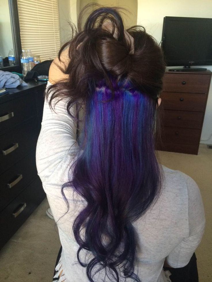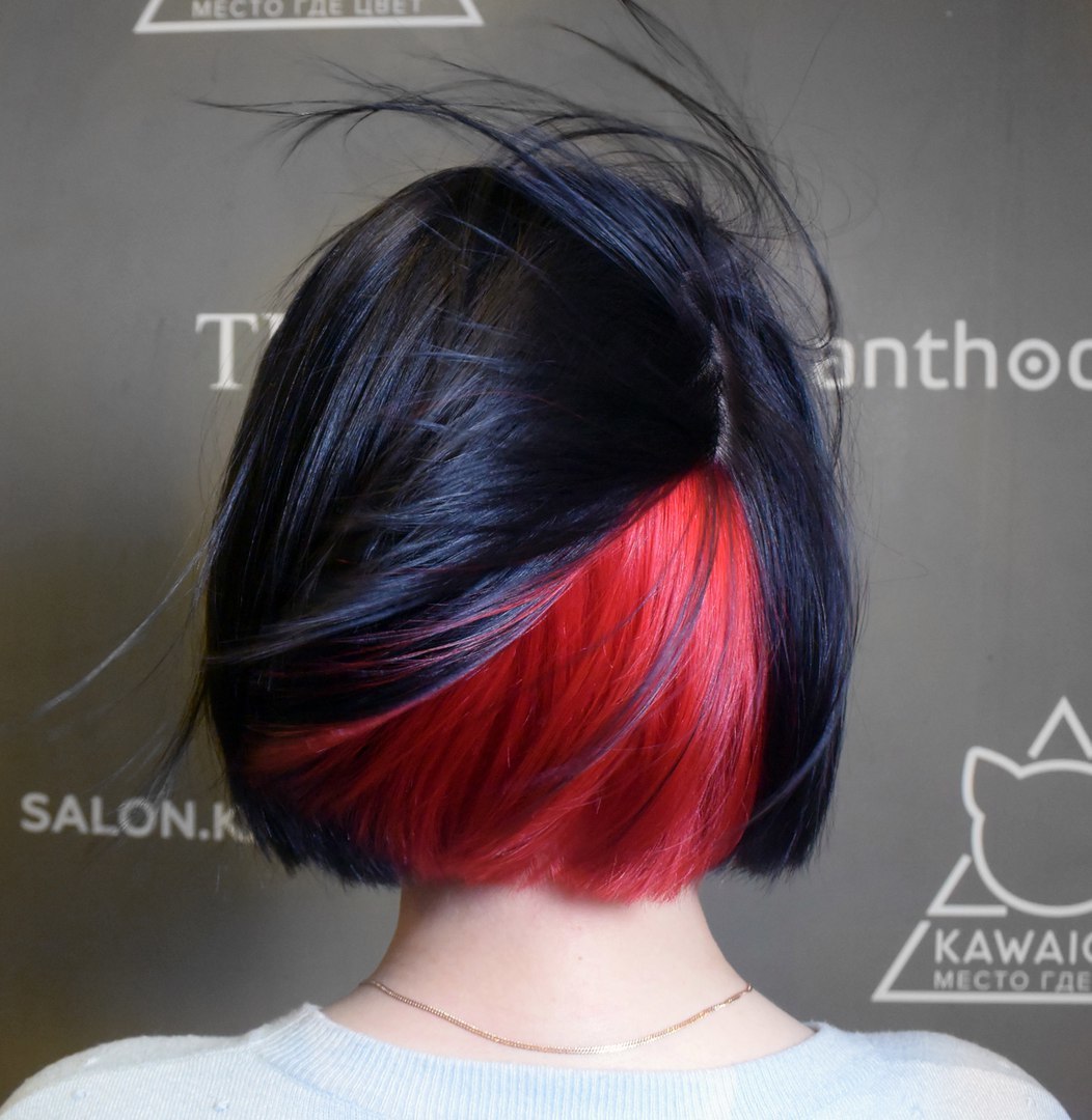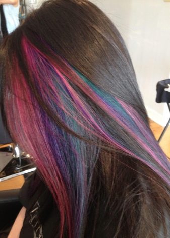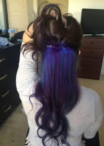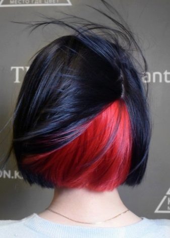 Ang nakatagong kulay sa maitim na buhok ay magmukhang orihinal gamit ang pulang kulay at lahat ng mga kulay nito. Para sa isang rich black color shades ng asul at lilang ay angkop.