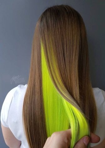 Bago ang pag-iilaw ng madilim na mga kulot, dapat munang magaan ang liwanag, kung hindi man ay makuha ang nais na maliwanag na lilim. Ang isa pang tampok ay haba ng buhok. Dapat itong maging tulad na, kung kinakailangan, maaari mong itago ang mga kulay na kulot, kaya ang kulay na ito ay hindi angkop para sa lahat ng mga haircuts.