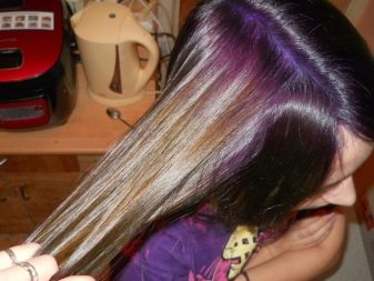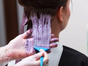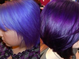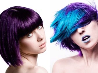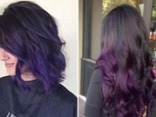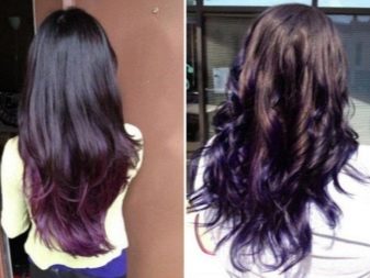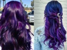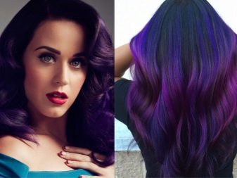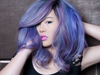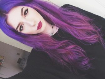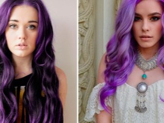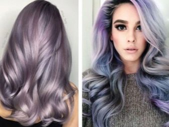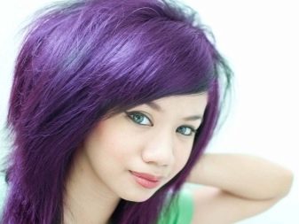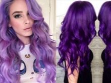 Pagdating sa lilang kulay, ito ay napakabihirang upang magkaroon ng isang tono paglamlam. Kadalasan, ang lilang ay ginagamit upang lumikha ng naka-istilong mga accent, na umaayon sa pangunahing tono ng buhok. Ang mga compound ay maaaring magkakaiba-iba: asul-lila, kulay-abo-lila, pula-lila, lila-berde, lila-asul, at din pastel-violet, violet-turquoise at chocolate-violet.