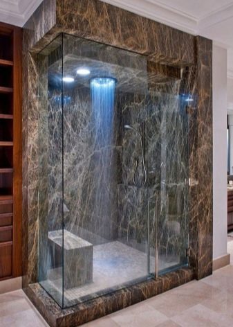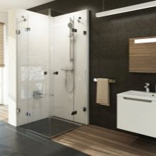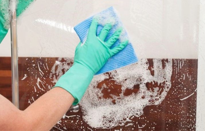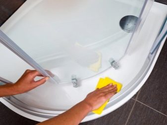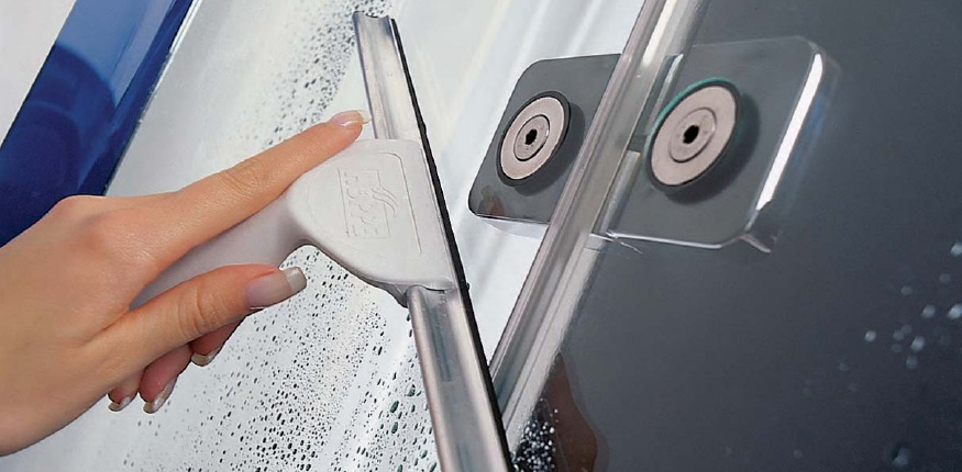 Laver correctement la partie en verre de la hydrobox n’est pas si difficile. À cette fin, tous les outils que vous utilisiez pour nettoyer les fenêtres et les surfaces des miroirs sont appropriés. La composition sélectionnée est pulvérisée sur le verre, laissez-la pendant un certain temps, puis essuyez sans arrosage supplémentaire.