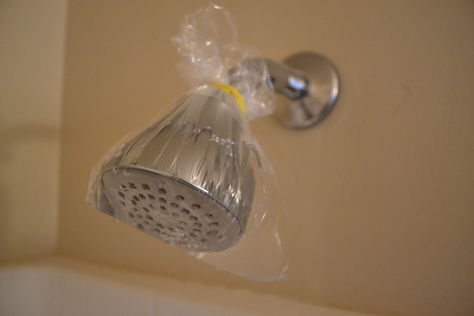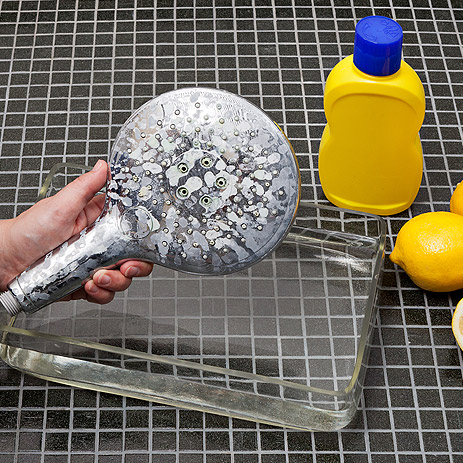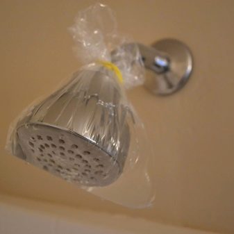- Une pollution dense se produit souvent sur les pommes de douche. Dans ce cas, ils devraient être mis dans le mélange. vinaigre avec de l'eau (les composants sont pris dans des proportions égales) et laisser pendant 8-10 heures. Vous pouvez soit démonter l’arrosoir sur les pièces, soit poser sur le dessus un sac contenant une solution dont le goulot est fermement attaché. Faites tout le travail uniquement avec des gants en caoutchouc! Cette méthode de nettoyage ramènera le fini chromé à son éclat d'origine et, en outre, réduira les risques de pollution.