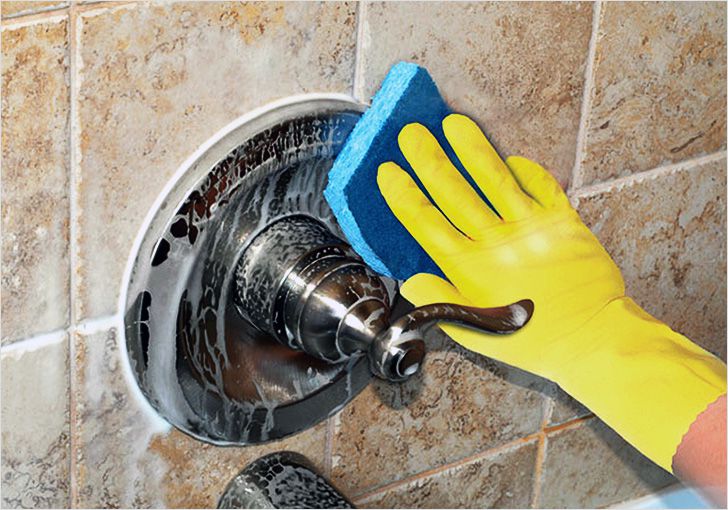 Près des drains, des robinets et des pulvérisateurs nécessite l’utilisation du détergent le plus dense, de consistance pâteuse ou crème. Appliquez une couche solide du médicament sur la zone à problèmes, attendez tant que cela est écrit dans les instructions et rincez bien. Cette solution permettra d'économiser la surface de la grue non seulement des dépôts de calcaire ou des traces de corrosion, mais même des moisissures les plus résistantes. En acier chromé est nécessaire pour laver le jus de citron ou frotter avec un dentifrice, il aidera à éliminer la saleté et à obtenir une brillance parfaite.