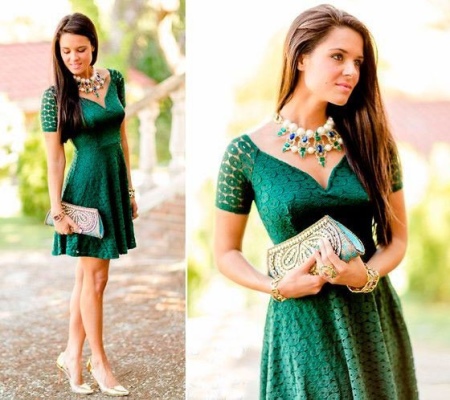 Một diện mạo mùa hè lãng mạn có được nếu bạn chọn một chiếc váy ren malachite sành điệu với tay áo ngắn, bổ sung cho nó với đôi giày tòa màu vàng và một chiếc ly hợp trang trí. Và cuối cùng thêm vào bên cạnh hạt lớn - dây chuyền với hạt lớn và đá lớn.