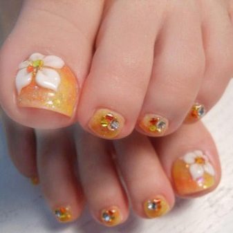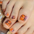 - Điêu khắc trên móng tay với tông màu cam với bột acrylic. Để nhận ra một thiết kế như vậy trên chân, tốt nhất là tăng móng của các ngón chân lớn, vì mô hình trông rất đồ sộ, và vị trí của nó sẽ cần nhiều không gian hơn so với thiết kế thông thường.