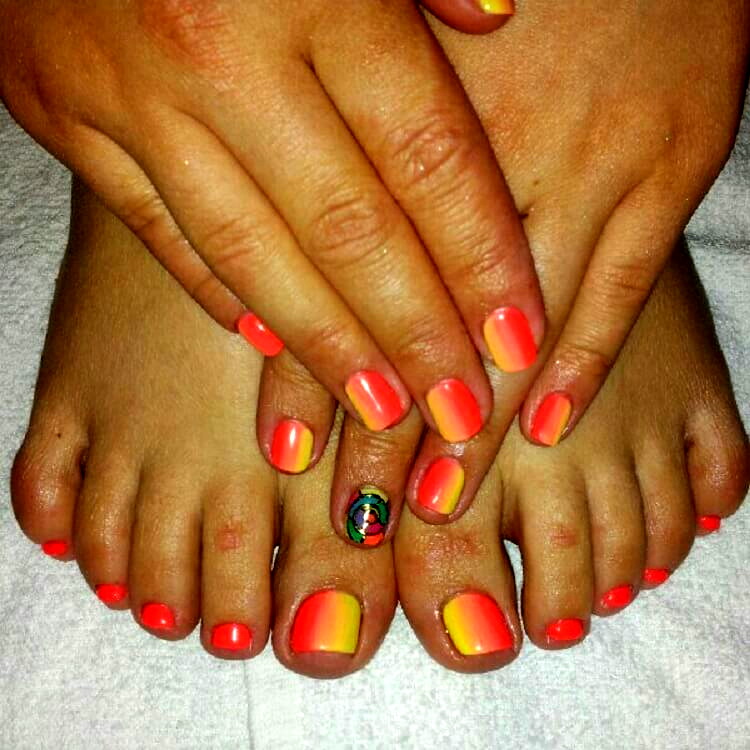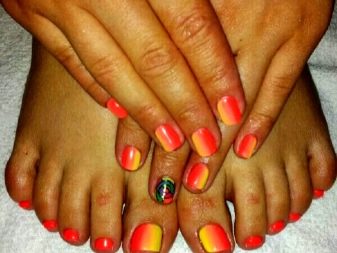 Bảo hiểm đơn sắc vẫn còn trong thời trang với sự giúp đỡ của màu cam và sắc thái của nó, cũng như ombre khác nhau. Sơn gel màu cam có thể mờ và bóng, chúng thường được chọn cho lớp phủ móng chân chất lượng cao, vì vecni thông thường tồn tại không lâu.