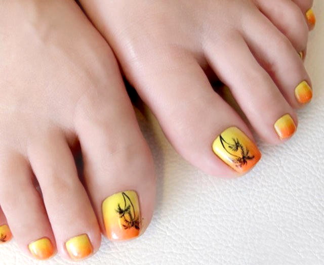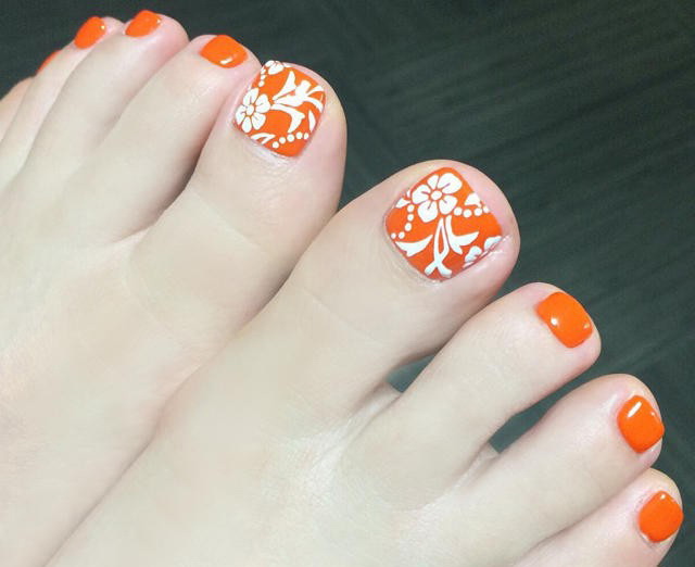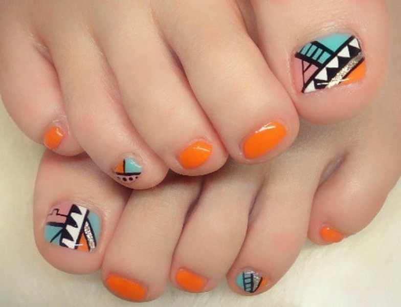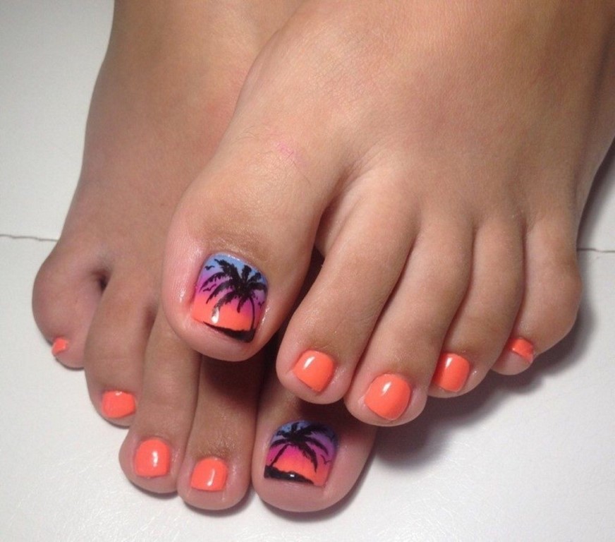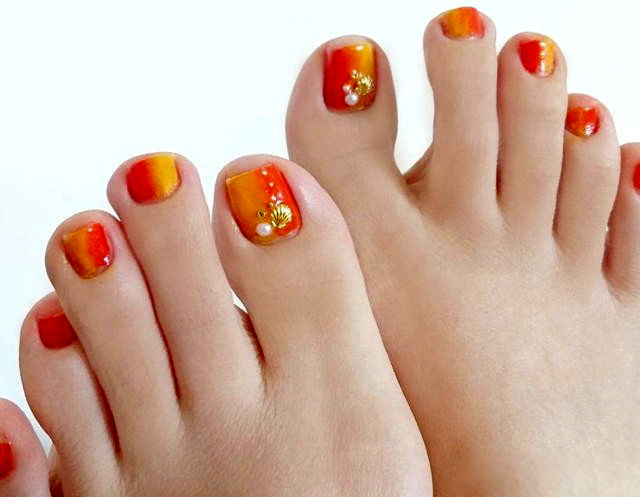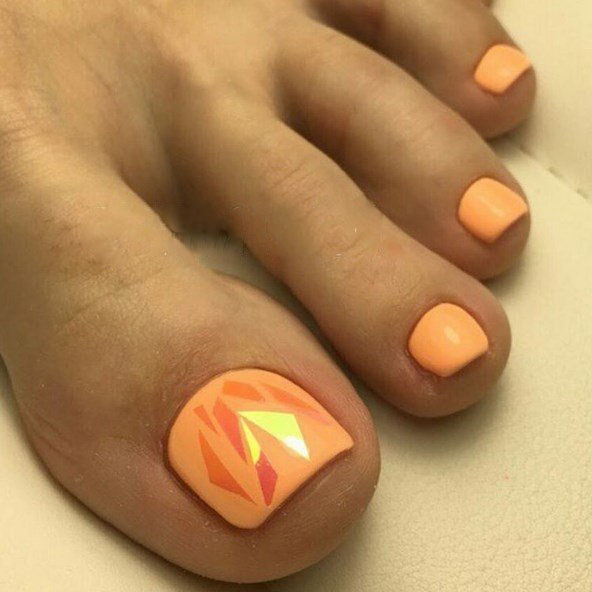 Để tạo ra một móng chân thiết kế sang trọng có thể được tăng lên, nhưng theo quy luật, một mẫu đẹp chỉ được tạo ra trên móng tay cái, tất cả những thứ khác chỉ cần che màu đã chọn. Theo nhiều chuyên gia của ngành nail, ngày nay các sắc thái sau của màu cam rất phổ biến: