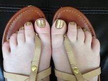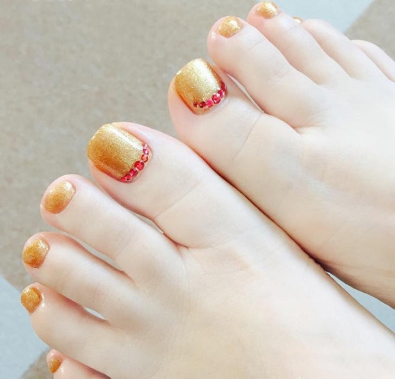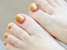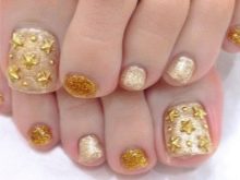 Để tạo ra một móng chân sang trọng, nên chọn sơn mài màu vàng. Kết hợp với sự lấp lánh của một sắc thái tương tự, Đá a la ngọc trai, trang trí đồ sộ, đá cuội, kim cương và ruy băng, lớp phủ này sẽ trông tuyệt đẹp.