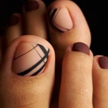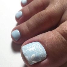 Và cũng là móng tay thời trang trên chân. Trong trường hợp này, bề mặt của tấm móng tăng lên, tương ứng, để áp dụng một mô hình hoặc sỏi trang trí là dễ dàng hơn nhiều. Có một không gian rộng cho sự lựa chọn: chấm bi, đồ trang trí trừu tượng, hoa, động vật, sọc, chủ đề biển. Thông thường, mẫu được thực hiện trên ngón tay cái, nhưng nếu trang trí được chọn không quá phức tạp trong thực thi, bạn có thể thử tạo lại nó trên mỗi ngón tay.