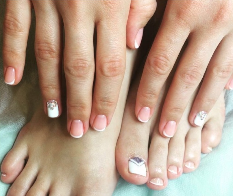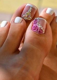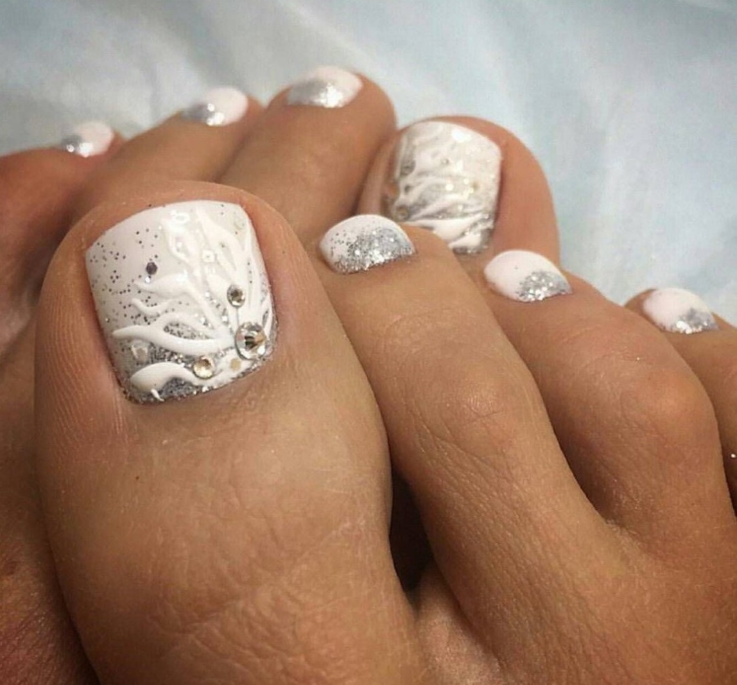 - Móng chân trắng với thiết kế trang trí của ngón tay cái sẽ trông thực sự sang trọng. Hầu như hoàng gia sang trọng được tạo ra thông qua việc sử dụng kim cương trắng, đá trang trí và hoa hồng khổng lồ.