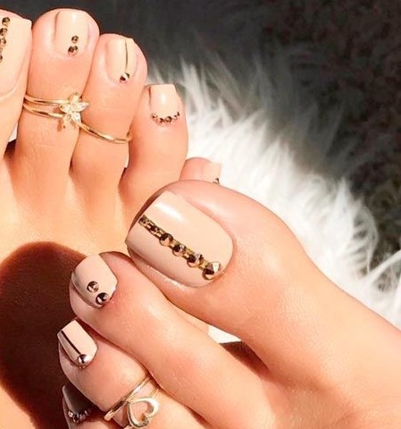 - Màu sắc nude của lớp phủ kết hợp với kim cương vàng được đặt trên hầu hết mọi ngón tay theo mẫu được thiết kế sẽ làm nổi bật vẻ đẹp tự nhiên của đôi chân và tăng thêm vẻ thanh lịch cho hình ảnh.