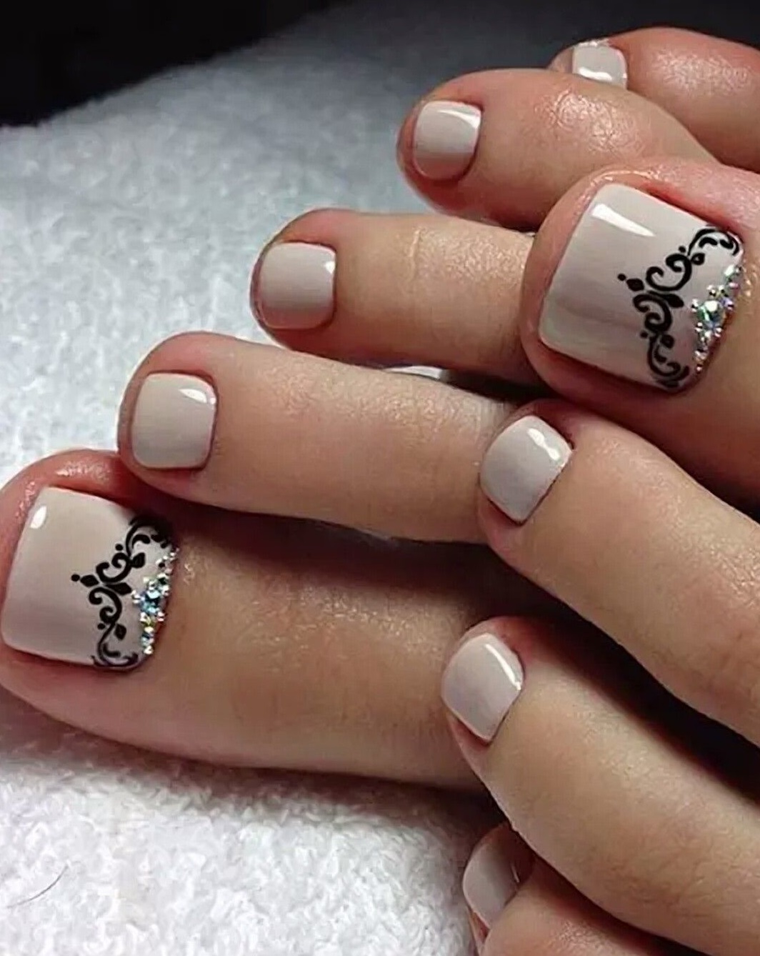 - Móng tay màu be trông rất trang trí trang nhã với ngón tay út trên ngón tay cái. Để tạo ra một thiết kế trang trí bằng cách sử dụng sơn mài đen và kim cương giả.