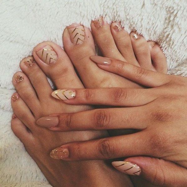 - Tông màu sáng là lý tưởng để tạo ra một móng chân biển. Ví dụ, 2 móng ở mỗi chân được phủ sơn mài trắng trên một dải màu xanh, với 1 và ngón thứ hai ở bên phải và 1 và 3 ở bên trái. neo Ngoài ra, những chiếc đinh này được trang trí bằng một chuỗi vàng mỏng. Các móng còn lại được phủ tông vàng sơn mài rực rỡ với sự bổ sung lấp lánh. Vàng là tốt nhất liên quan đến mặt trời và cát biển.
