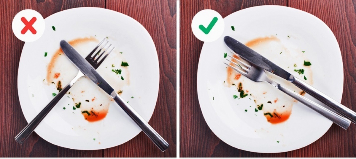 Để báo cáo rằng bạn đã sẵn sàng để phục vụ món ăn tiếp theo, đủ để vượt qua các thiết bị trực tiếp trên đĩa, xoay dao sang trái và nĩa sang phải. Nếu bữa ăn đã kết thúc, bạn cần sắp xếp các thiết bị song song với nhau dọc theo đường chéo của đĩa.