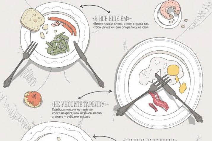 Ví dụ, để tránh các món ăn được làm sạch sớm, bạn có thể báo hiệu rằng bạn tạm thời làm gián đoạn bữa ăn hoặc vẫn tiếp tục quá trình, đặt các thiết bị lên đĩa. Các mặt của sự sắp xếp vẫn giữ nguyên: bên trái - một cái nĩa hoặc muỗng, bên phải là một con dao.