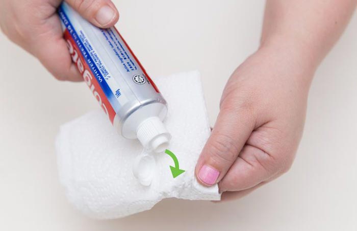 - Điều đó xảy ra rằng trong tay không có keo xịt tóc, cũng không có rượu, cũng không có bất kỳ phương tiện nào khác được liệt kê ở trên. Nhưng trong nhà luôn có kem đánh răng. Sản phẩm vệ sinh răng miệng này cũng có thể giúp đỡ. Nhưng nó nên được lưu ý rằng dán nên có màu trắng trơn, không gel và không màu. Thoa một lượng nhỏ kem đánh răng vào đĩa và chà nhẹ móng tay của bạn.