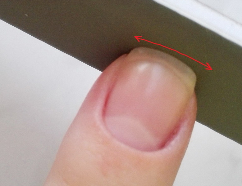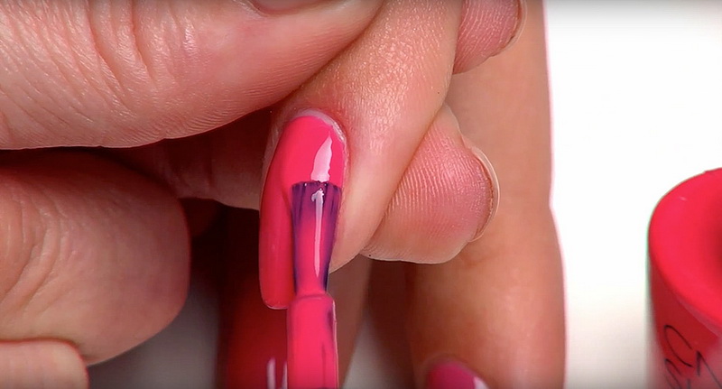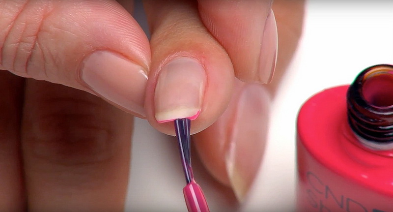 - Lấy một bàn chải và nhúng nó trong một gel thông thường. Loại bỏ chất lỏng dư thừa và nhẹ nhàng làm mờ cạnh của tấm móng, giữ bàn chải ở vị trí vuông góc, với một bó tóc đến đầu ngón tay. Điều này sẽ cung cấp một cơ hội để ngăn chặn móng tay bị bong ra khỏi tấm móng tay.