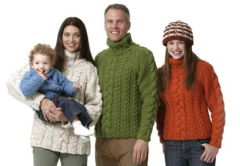 Nhưng hàng dệt kim "shop" thông thường không kém phần phổ biến, đặc biệt là với sự xuất hiện của mùa thu, và sau đó là mùa đông, mà ở vĩ độ Nga hiếm khi lạnh. Đầu tiên, áo cao cổ, áo len và đế mềm xuất hiện trong tủ quần áo của chúng tôi, sau đó là những chiếc mũ rộng rãi, áo len có bím hoặc hoa, khăn quàng cổ ấm áp và găng len. Cả người lớn và trẻ em đều mặc những thứ này.