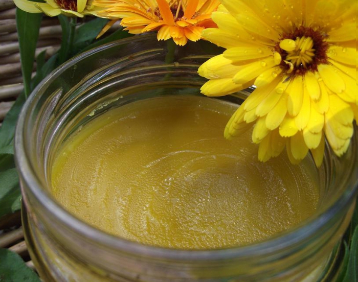 Lấy một muỗng canh hoa cúc khô và calendula và trộn đều. Hỗn hợp thu được là cần thiết để rót một nửa cốc nước sôi và nhấn mạnh khoảng nửa giờ. Sau thời gian truyền dịch được vắt qua vải và thêm ba muỗng cà phê glycerin.