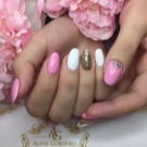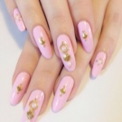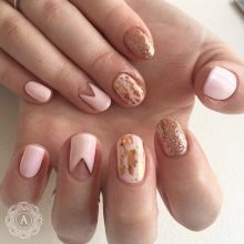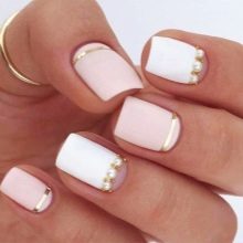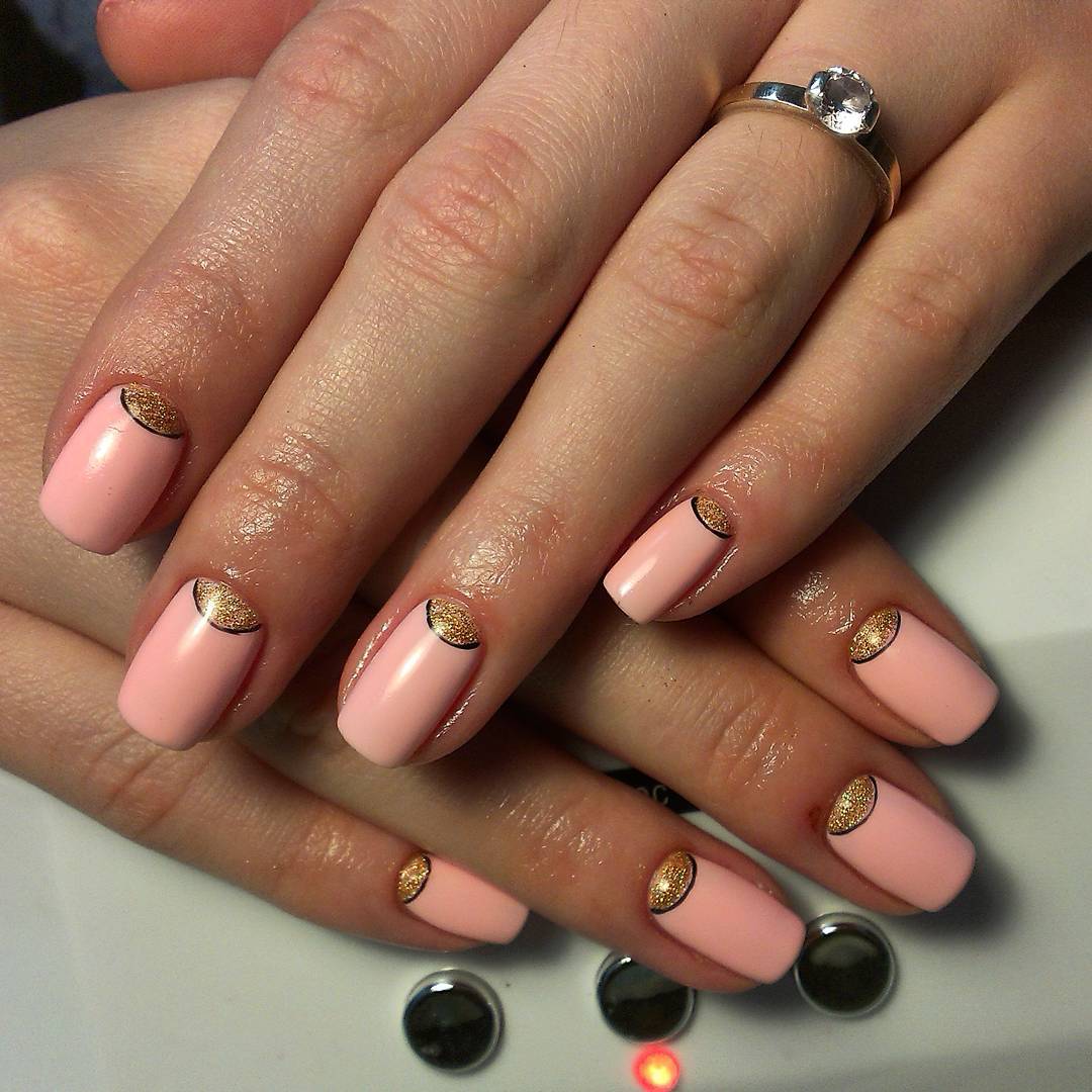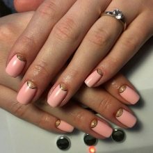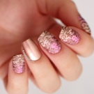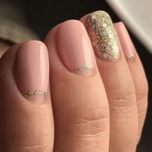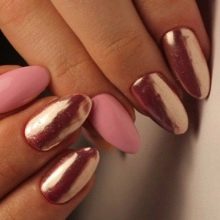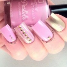 Ưu điểm chính của việc làm móng này là tính linh hoạt của nó., bởi nhờ các sắc thái tinh tế của sơn mài màu hồng, bạn có thể tạo ra một móng tay, sẽ phù hợp trong công việc, đi dạo và tại một sự kiện buổi tối. Vàng trong trường hợp này làm tăng thêm sự trang trọng cho thiết kế, nhưng hiệu ứng này được làm mịn một cách nhẹ nhàng bởi tính trung lập của màu hồng.