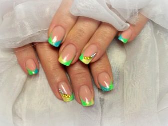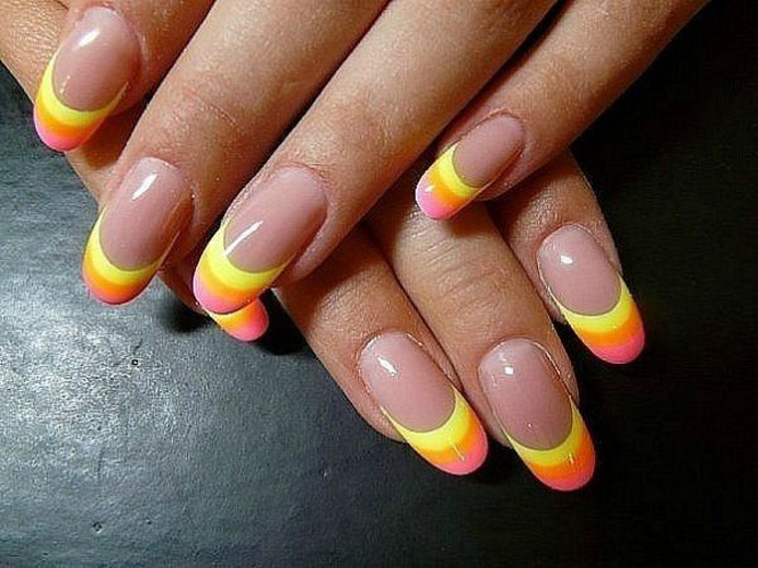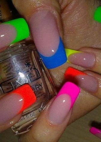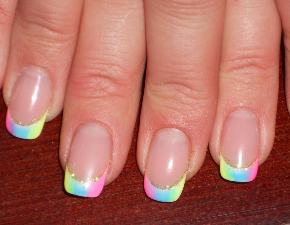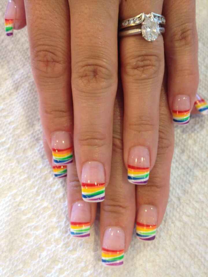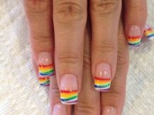 Cầu vồng được áp dụng cho móng với các lớp màu. Các sọc màu vẽ dọc theo nụ cười xen kẽ, tạo hiệu ứng cầu vồng. Thiết kế tuyệt vời cho móng tay dài hình bầu dục. Hóa ra tiếng Pháp đầy màu sắc. Trên chiều dài ngắn, chỉ có 2 hoặc 3 dòng màu có thể phù hợp, từ đó hình ảnh của cầu vồng mất đi sự say mê.