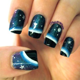 Hiệu quả của bề mặt gương thu được bằng cách cọ xát. Móng tay vũ trụ là ấn tượng cho sự độc đáo của họ. Ngọc trai và sắc tố cầu vồng đạt được hiệu ứng phi kim mềm mại, mang lại sự nhẹ nhàng và tươi mới cho móng tay Pháp.