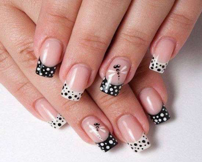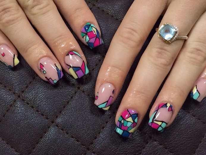 Các bức tranh khảm trên móng tay vuông được vẽ màu tối. Sau đó, các tế bào có thể được sơn bằng vecni sáng. Các tế bào thường được đặt bên ngoài đường nụ cười. Móng tay ngắn trực quan kéo dài trang trí kim cương. Ngoài ra, móng tay Pháp là thời trang để trang trí vòng tròn với nhiều kích cỡ khác nhau. Để vẽ bản vẽ sử dụng dấu chấm, tăm, kim, que màu cam.