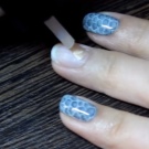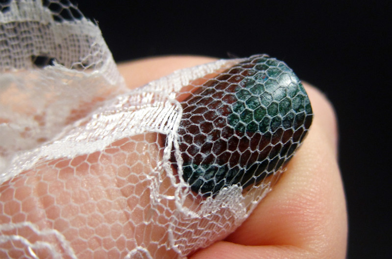 Bọt biển sơn mài màu được áp dụng trên lưới. Sau khi làm khô lớp trên, lưới được loại bỏ cẩn thận. Lớp hoàn thiện cắt bề mặt của móng và giúp tránh thô ráp.