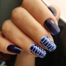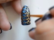 Để phủ lưới, bạn có thể chọn các ô hình thoi hoặc hình chữ nhật có kích thước mong muốn. Đầu tiên, sơn đen, xanh lá cây, xanh dương hoặc xám được áp dụng, sau đó gel màu vàng hoặc cam được thêm trực tiếp vào tế bào. Lưới nên được ép tốt vào móng. Sau khi sấy khô, mỗi tế bào được lấp đầy bằng một giọt gel trong suốt. Để thêm âm lượng cho hình ảnh, quy trình có thể được lặp lại.