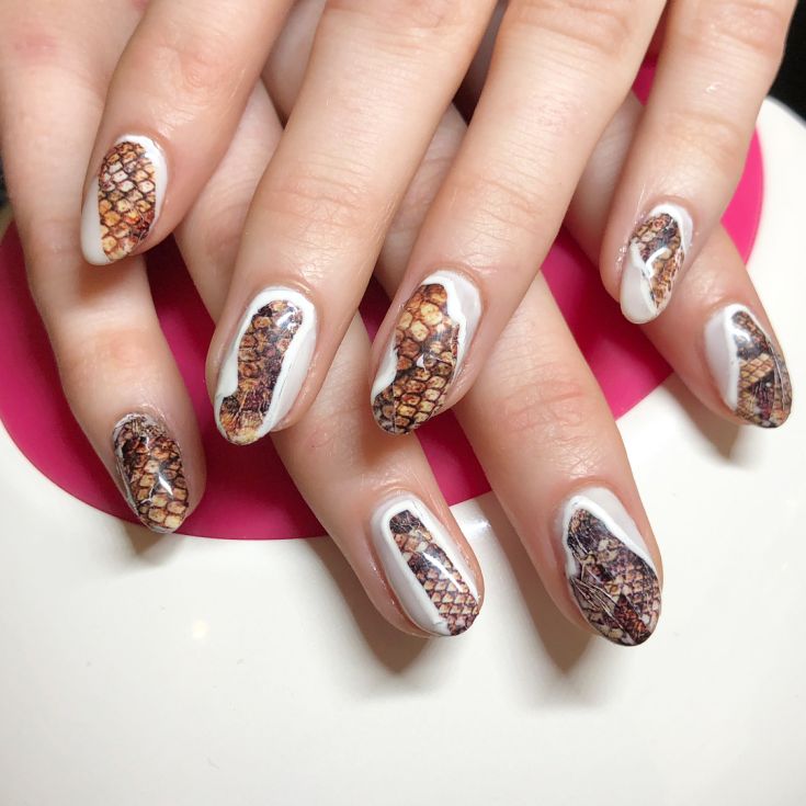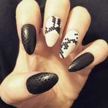 Mẫu da rắn kết hợp hoàn hảo với bất kỳ chiều dài nào của tấm móng hình chữ nhật, hình bầu dục, hình tam giác, hình vuông và hình tròn. Thiết kế móng tay này được sử dụng với niềm vui của những người đẹp trẻ tuổi và phụ nữ có uy tín. Móng tay trông duyên dáng, thanh lịch, nhưng thách thức. Họ ngay lập tức thu hút sự chú ý của người khác.