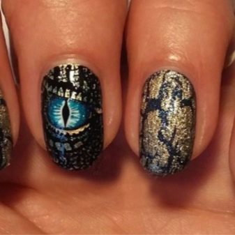 Mắt của con rắn tô điểm cho một trong những cái đinh trên cánh tay. Thường thì nó có vẻ đáng sợ. Tất cả các móng tay được làm theo phong cách serpentine, nhưng chỉ trên một cái chúng ta gặp với vẻ ngoài của một loài bò sát.