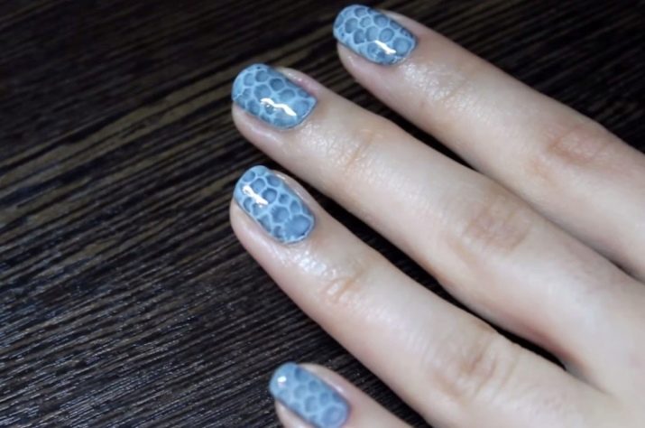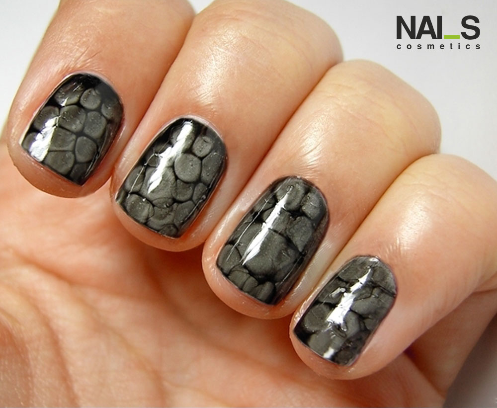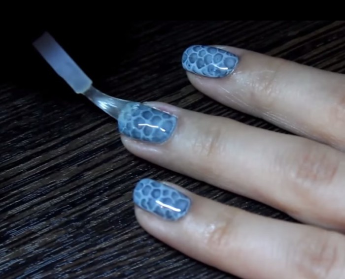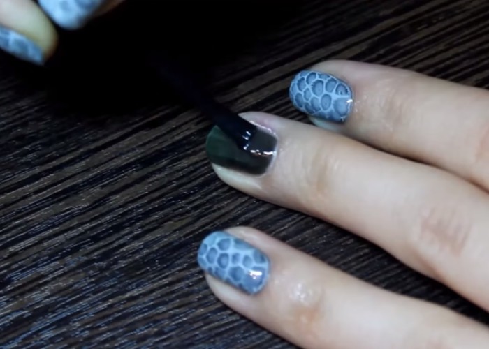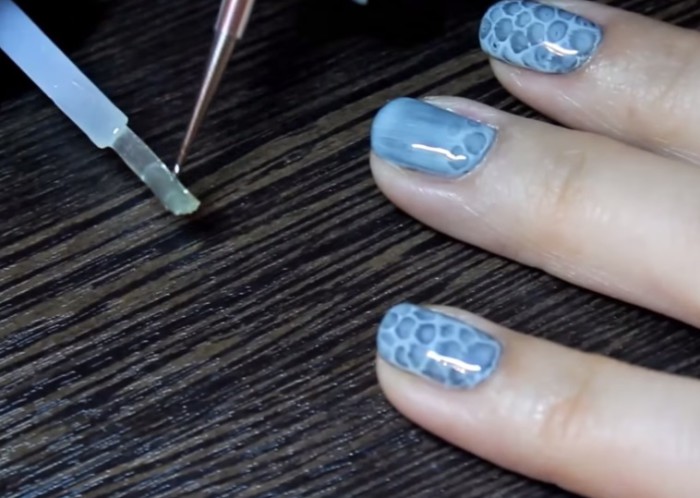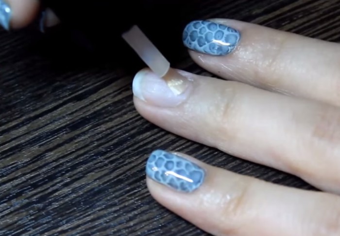 Có một trong những cách dễ nhất để tạo ra các thiết kế móng tay với vẻ ngoài của vảy rắn bằng kỹ thuật craquelure. Để làm điều này, lấy một vecni có tác dụng đặc biệt là nứt và đặt vào tấm móng.