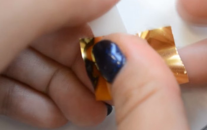 Chuyển lá sẽ giúp tạo ra các tế bào sáng bóng. Cần phải hành động nhanh chóng và chính xác: ấn mạnh giấy bạc lên bề mặt móng và đột ngột gỡ bỏ. Lớp dính sẽ lấp lánh rất đẹp. Đóng khung kim cương có vảy sẽ có được một cái nhìn nhấp nháy.
