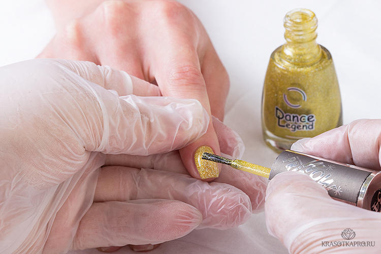 Đầu tiên, một lớp đế mỏng được đặt, được sấy khô trong 2 phút trong đèn. Sau khi áp dụng một lớp tối, cũng khô trong 2 phút, các đốm màu sáng được thêm vào móng tay. Bong bóng thích hợp có thể được tạo ra bằng cách sử dụng dấu chấm. Một lớp gel chưa khô được chuyển thành các phần vảy.
