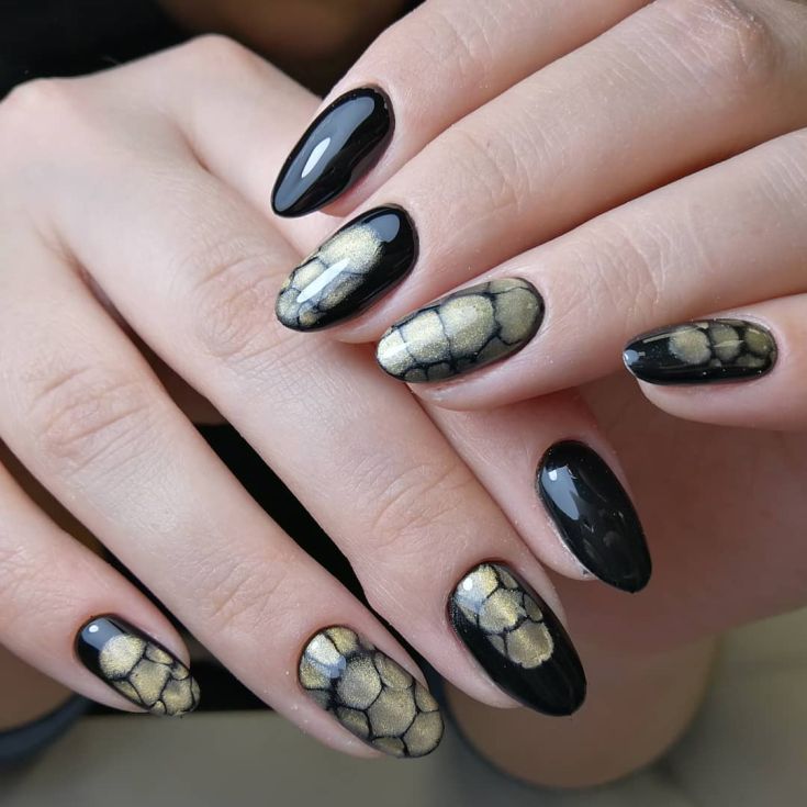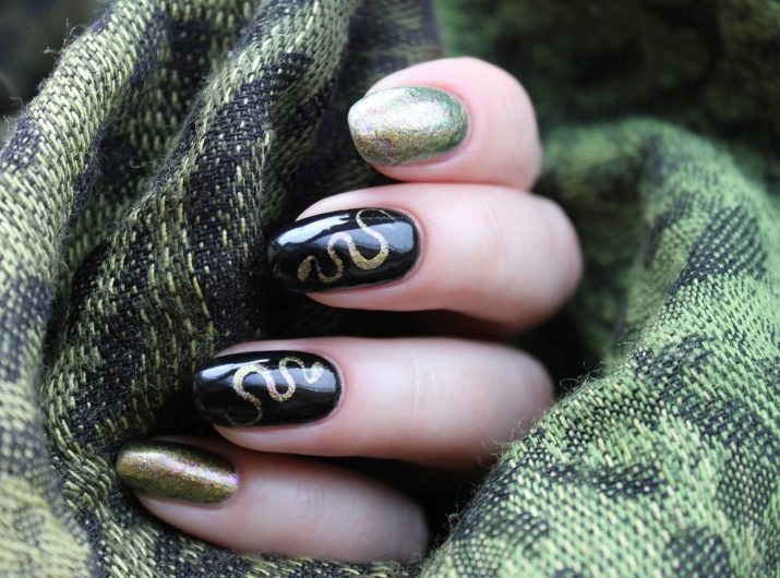 Blondes nên đặt một mô hình màu đen trên nền vàng. Ngăm đen là tông màu đen và trắng phù hợp hơn xen kẽ với màu đỏ. Việc trang trí các loài bò sát màu xanh và màu xanh lá cây phù hợp cho năm mới. Móng tay như vậy đặc biệt thích hợp cho những người trong trang phục lễ hội.