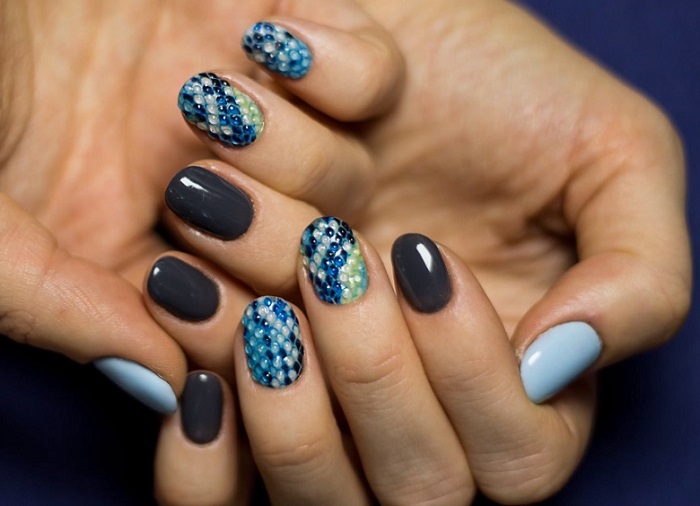 Sự sắp xếp cờ vua của các tế bào thu hút nhiều người yêu thích làm móng với một hình ảnh bò sát. Để ngăn những giọt nước lan rộng, nên sử dụng riêng từng loại trong vài giây để làm khô trong đèn. Ở giai đoạn cuối cùng, tất cả các móng tay được làm khô hoàn toàn và một lớp mịn của dụng cụ sửa chữa được áp dụng trên đầu. Các ngón tay một lần nữa được đặt trong đèn cực tím. Lớp dính phải được loại bỏ.