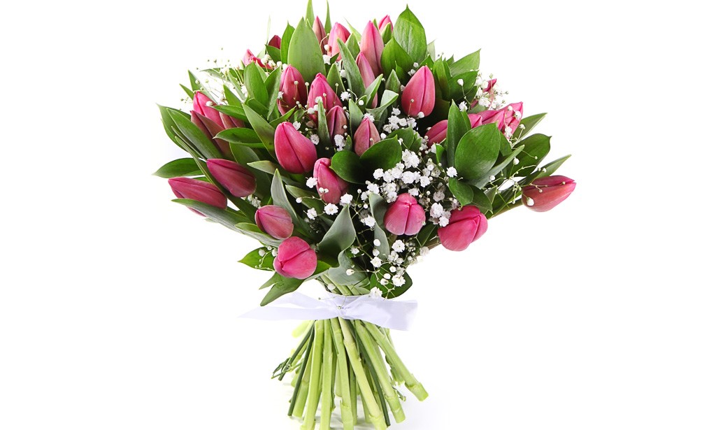 - Hoa tulip. Nếu là mùa xuân bên ngoài, thật khó để tìm thấy thứ gì đó phù hợp hơn hoa tulip. Hoặc một bó hoa tuyệt đẹp, nơi sẽ có hơn một tá, hoặc 7 thứ, được pha loãng với gypsophila - trông thật thuyết phục, tươi sáng, trang trọng.