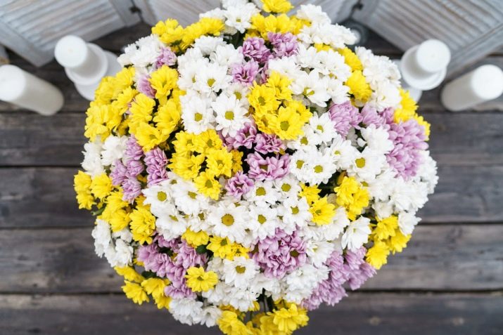 - Hoa cúc. Ngân sách, nhưng không phải là một lựa chọn vượt qua. Bó hoa càng tráng lệ thì càng tốt. Đừng ngại trộn các sắc thái từ trắng đến tím đậm. Những bông hoa với số lượng lớn không cần bao bì đặc biệt.