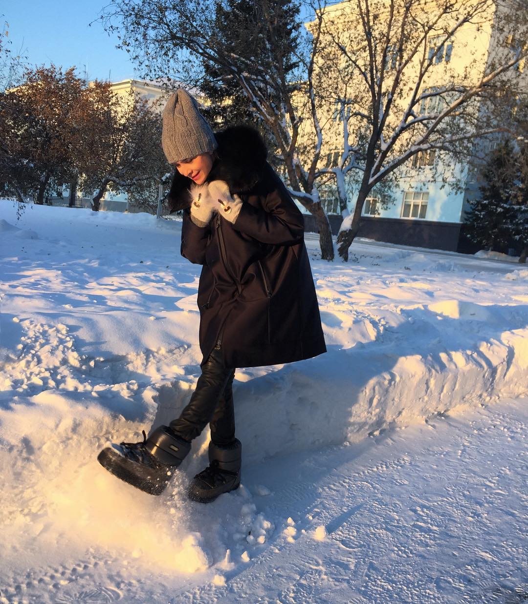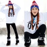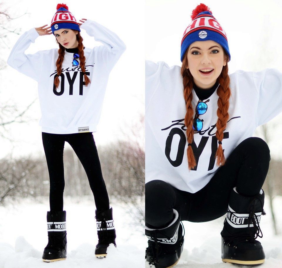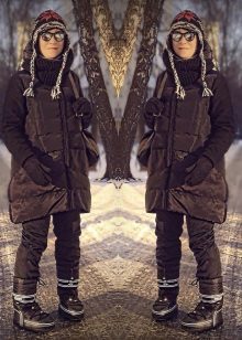 Nhiệm vụ thể thao với phần trên rộng, được trang trí với một sọc ngang tương phản với một dòng chữ, như thể chúng không phải là chủ đề của phong cách khác trong hình ảnh này. Quần legging đen, mũ và áo khoác cùng màu trông hài hòa đến kinh ngạc. Chiếc áo khoác lông màu xám xám ở đây không chỉ thực hiện chức năng thẩm mỹ mà còn, nếu cần thiết, dễ dàng làm ấm bộ đồng phục đã khá ấm cúng này.