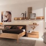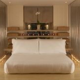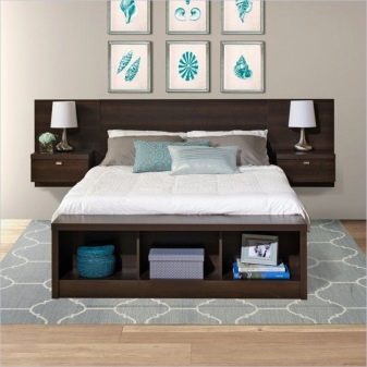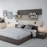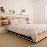 - Giá đỡ với một lề đường ở đầu giường. Thông thường, thiết kế này được kết nối với chính giường. Không cần phải sửa nó ở đầu giường, chính chiếc giường tạo nên kệ và ý tưởng thiết kế cho phép bạn tận dụng tối đa không gian.