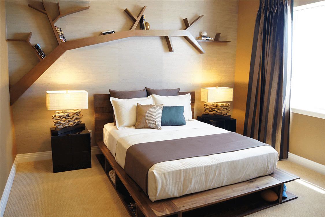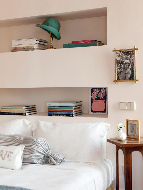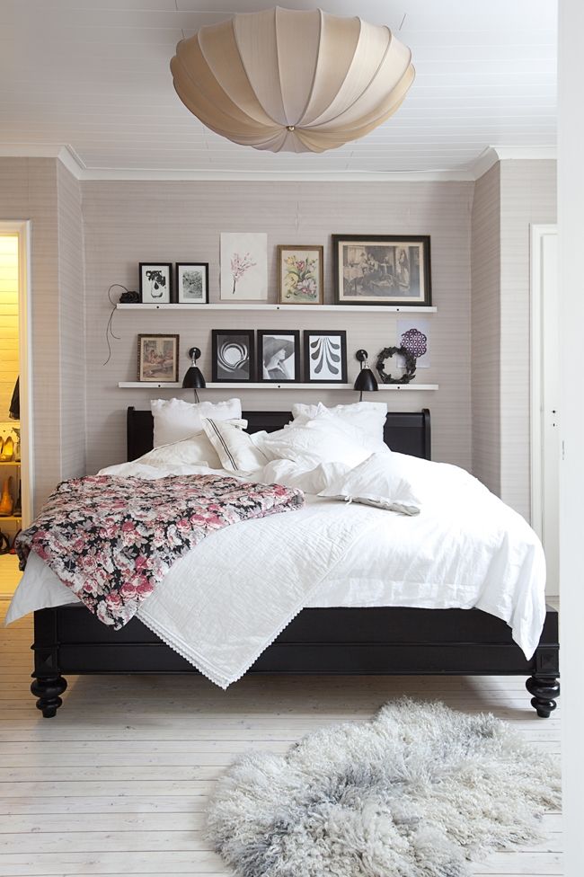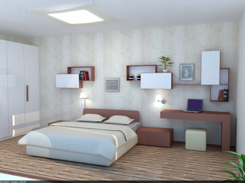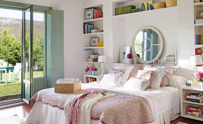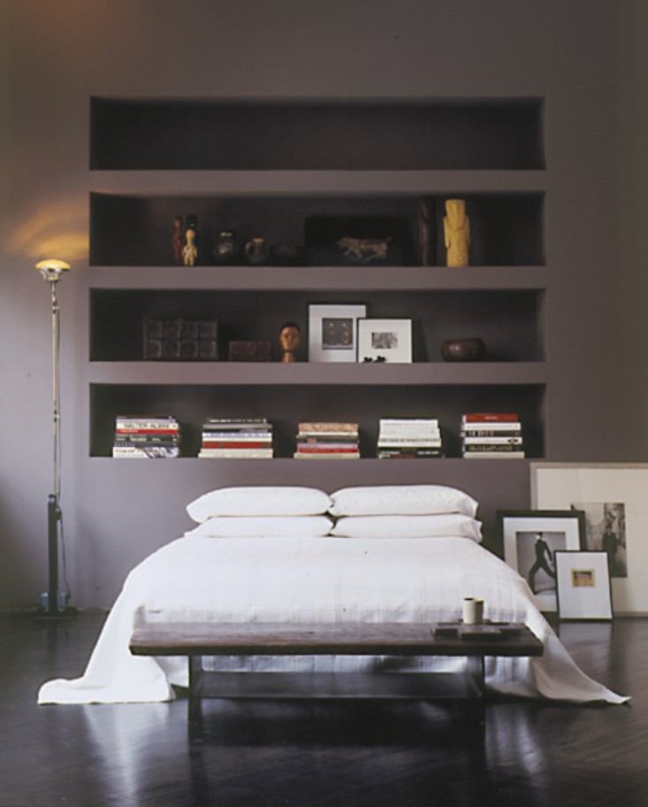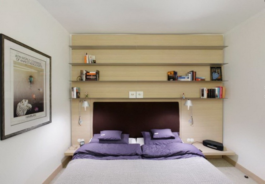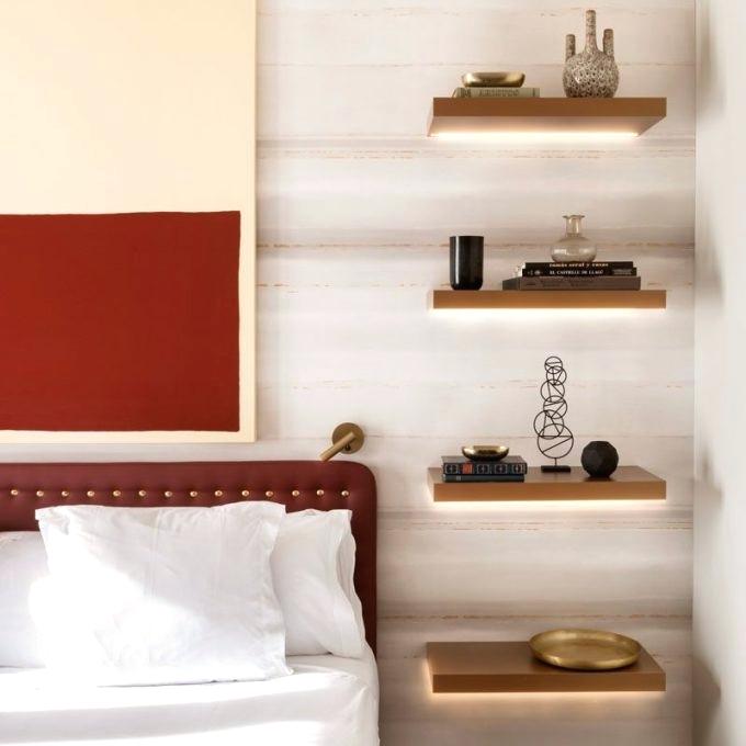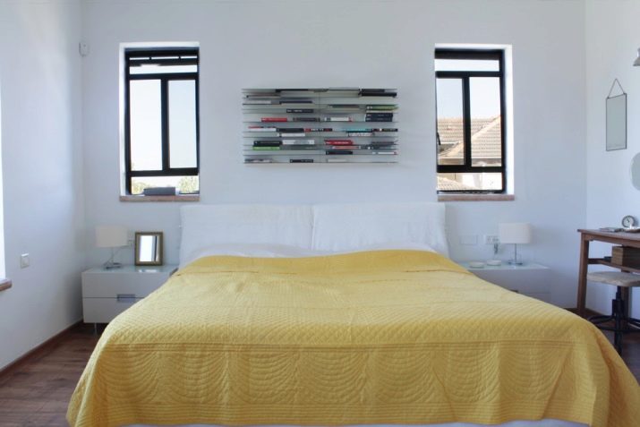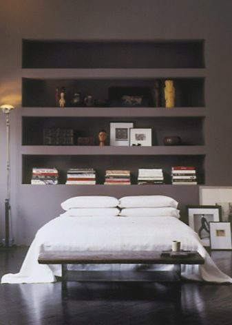 Điểm duy nhất để xem xét là: nếu phòng ngủ của bạn có màu pastel hoặc màu trắng, kệ có thể bị mất trong nền của chúng, và nếu màu sắc tổng thể khá sáng, thì kệ sẽ tương phản với toàn bộ bức tranh, thêm ghi chú ngoạn mục.