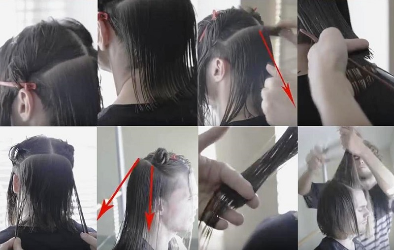 - Cắt tóc phần dưới theo nguyên tắc "sợi trên sợi".