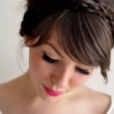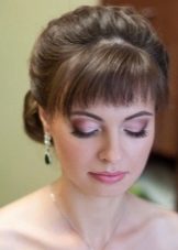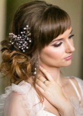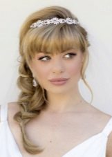Phong cách của kiểu tóc cưới với tóc mái không có giới hạn. Đối với trường hợp như vậy, bạn có thể chọn, ví dụ, phong cách Hy Lạp phổ biến, nhờ đó bạn có thể xuất hiện trước các vị khách dưới dạng một nữ thần thực sự từ các thần thoại cổ đại. Phong cách này cho thấy các tùy chọn dệt bện ban đầu. Tóc dài trung bình khá cho phép bạn thực hiện các kiểu tóc như vậy. Bổ sung cho kiểu dáng như vậy thường là ruy băng hoặc hoa. Phù hợp với hình ảnh của một vương miện hoặc một khung bezel duyên dáng.