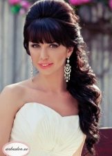 Tóc mái dài cho phép bạn loại bỏ nó theo nhiều cách khác nhau. Với tóc dài trung bình, phần tóc trên đầu này có thể được nâng lên và tính vào tổng trọng lượng, hoặc bạn có thể tập trung vào nó bằng cách đặt nó, ví dụ, trong một sóng. Một lựa chọn tốt là chải nó sang một bên hoặc đâm nó để nó không cản trở mắt. Và cũng khi tạo kiểu tóc cho cô dâu, phần tóc mái được chia thành hai phần bằng nhau, phần tóc ở giữa và làm cho nó trở thành một khung đẹp. Hầu hết tất cả, tùy chọn này phù hợp cho chủ sở hữu khuôn mặt hình bầu dục.