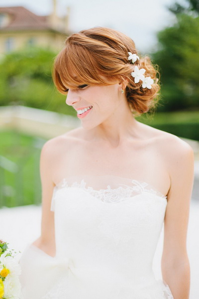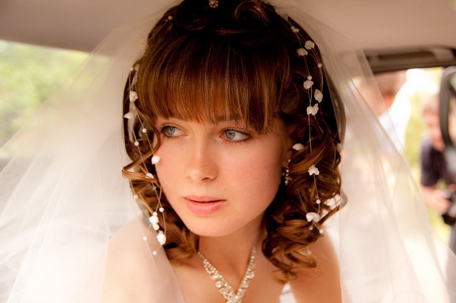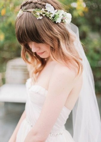 Kiểu tóc cưới có thể rất hạn chế. Nó phù hợp với tóc mái dài hoàn hảo, nằm nghiêng. Các sợi xoắn thú vị ở trên nó đa dạng hóa hình ảnh. Kiểu tóc có độ dài trung bình có thể được thực hiện rất đơn giản. Xoắn các đầu của các lọn tóc, lấy chúng bằng một bím tóc mỏng từ sợi của chúng và trang trí bằng hoa. Một tấm màn che và tóc mái dày thẳng sẽ hoàn thành hình ảnh, làm cho nó mềm mại và tinh tế.