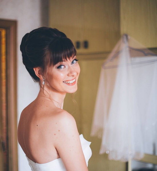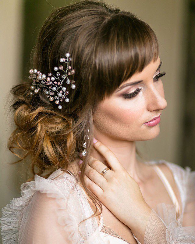 Tóc mái xiên có thể trang trí hầu hết mọi kiểu tóc. Nó kết hợp với độ cao khi các lọn tóc được rút lại một cách tuyệt vời và rơi tự do trên vai. Kiểu dáng như vậy cho tóc dài trung bình cho phép bạn làm cho hình ảnh sáng và sáng. Tóc mái xiên, trái ngược với tóc thẳng, cho phép bạn tạo ra đồ trang sức trên đầu từ những bím tóc phức tạp nhất. Thật thú vị khi làm với một tùy chọn tóc trên trán kiểu tóc đuôi ngựa. Tóc mái ngắn cũng gợi ý tưởng về một mái tóc như đuôi hay búi tóc. Bất cứ lựa chọn nào cô dâu chọn, với kiểu tóc mái như vậy chắc chắn sẽ không can thiệp.